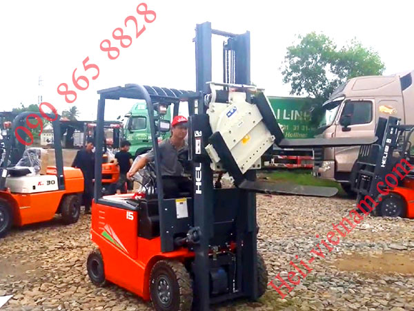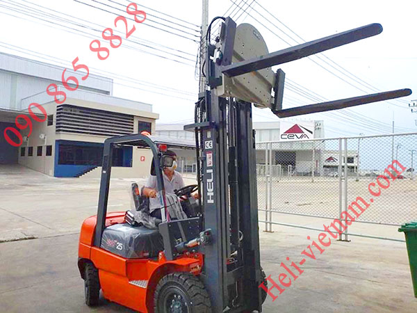 Khi chiếc xe nâng được lắp thêm bộ công tác mâm xoay. Ngoài chức năng nâng hạ như 1 chiếc xe nâng bình thường. Thì xe có thể nâng xoay đổ hàng từ các thùng chứa hoặc pallet lên thùng xe.